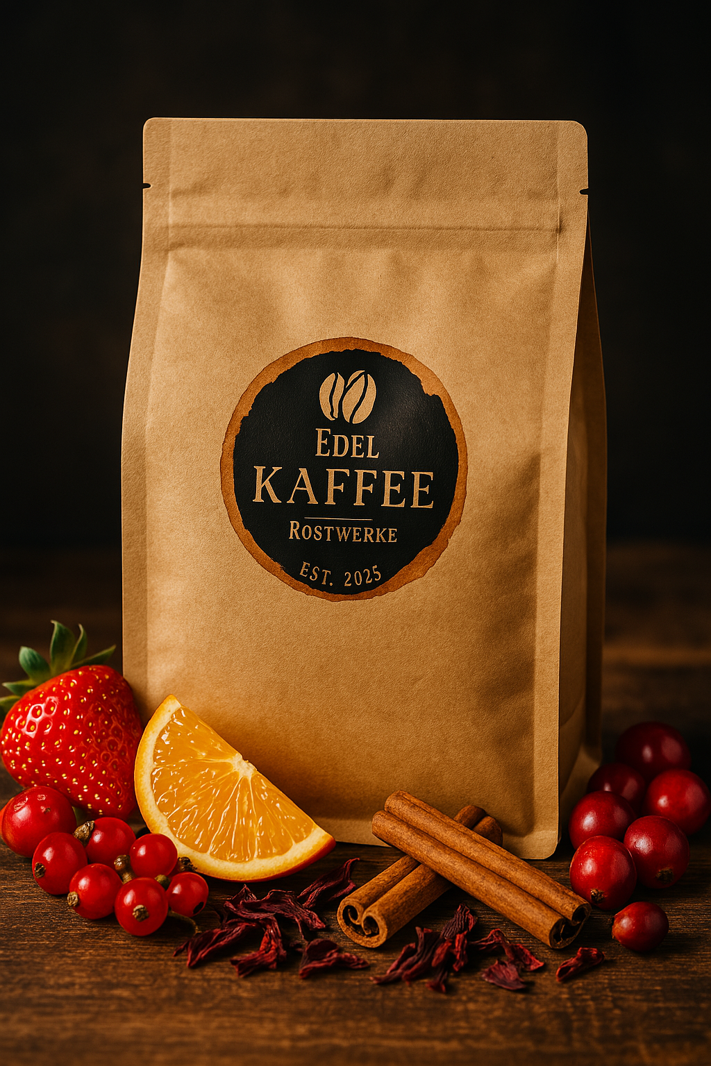 Edel Kaffee Röstwerke Kraft Kaffee Packung von vorne mit den Früchte daneben.